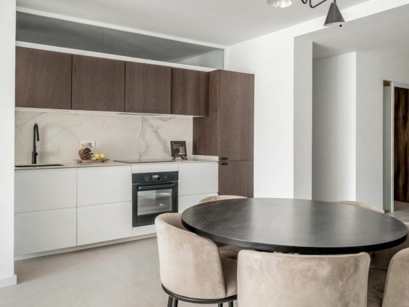The open-plan living and dining area welcomes you with high ceilings and stylish spotlights, creating an ambiance of modern luxury and comfort. Whether you're entertaining guests or enjoying quiet evenings in, this space is designed for both relaxation and socializing.