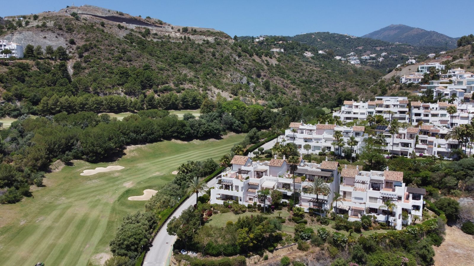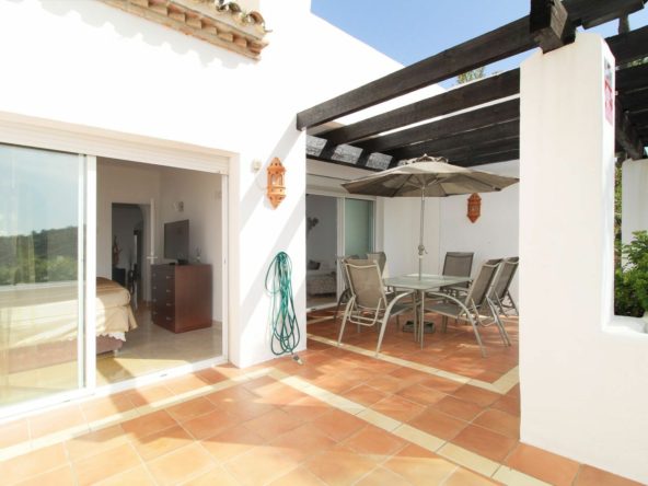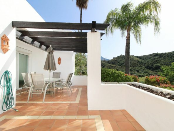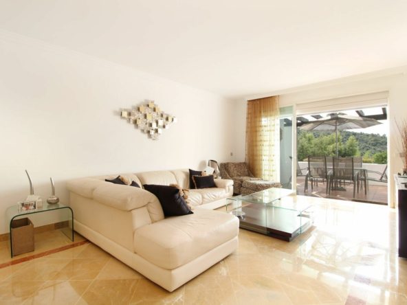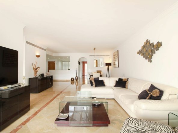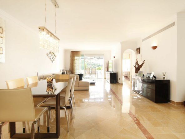 Situated in a renowned gated community in La Quinta, overlooking the golf course with the Mediterranean in the distance, lies this stunning and exceptionally spacious ground-floor apartment. It was designed by the iconic architect Melvin Villarroel, known for creating many of Marbella’s most desirable communities, including the Puente Romano and Kempinski Hotels.