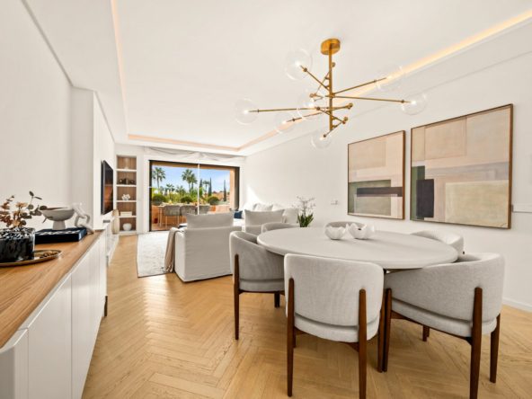 The living room features high-quality furniture, creating a refined yet inviting setting for relaxation. The modern open-plan kitchen comes fully equipped with top-of-the-line appliances.