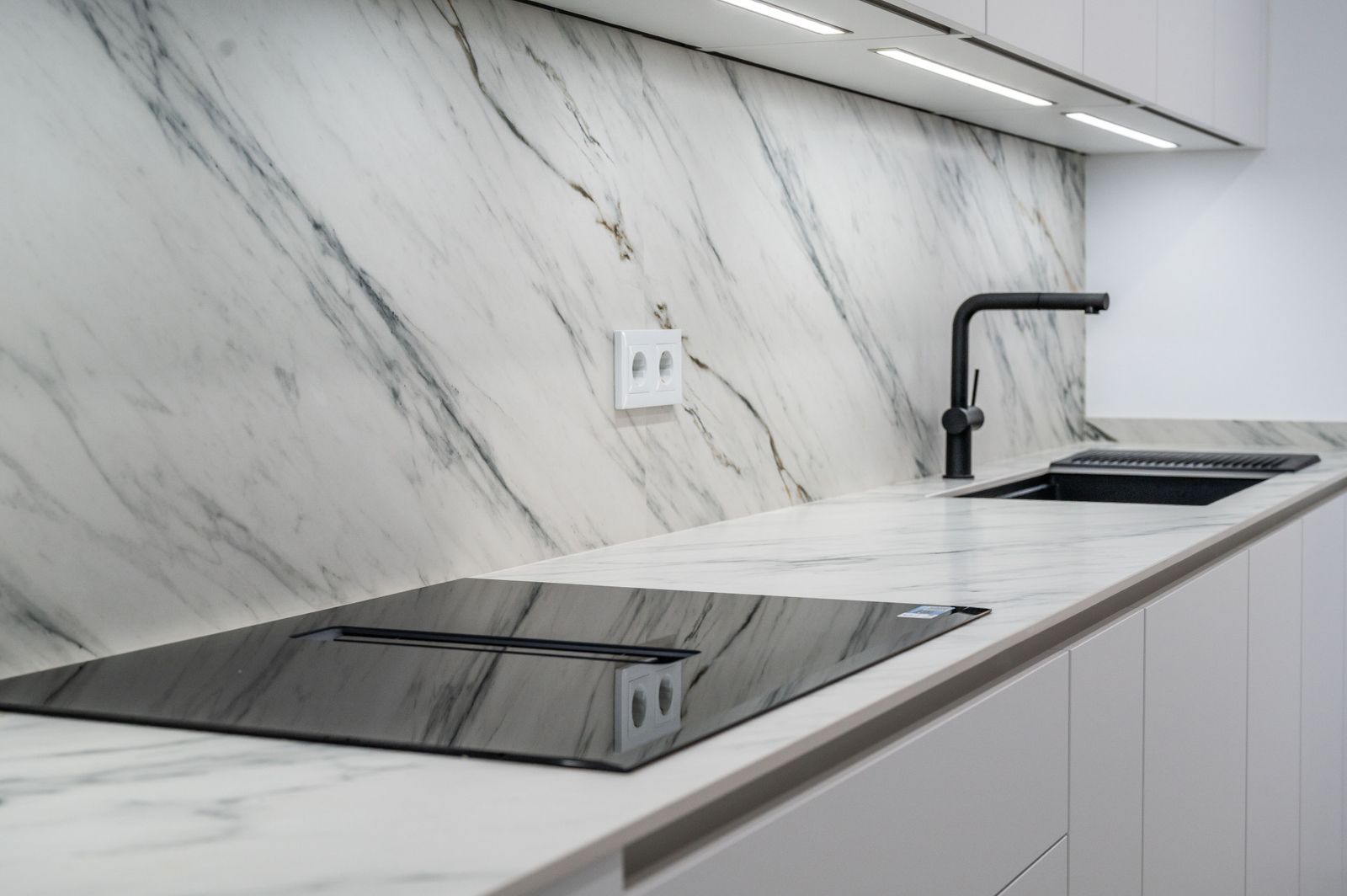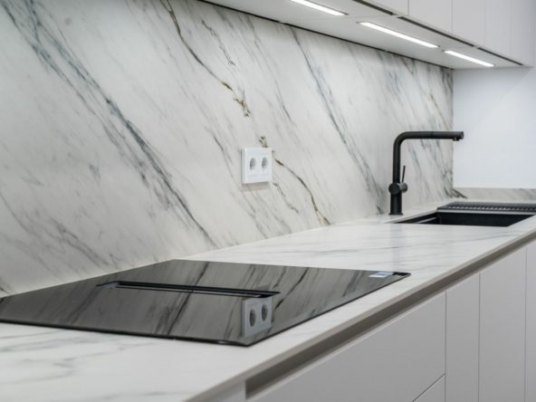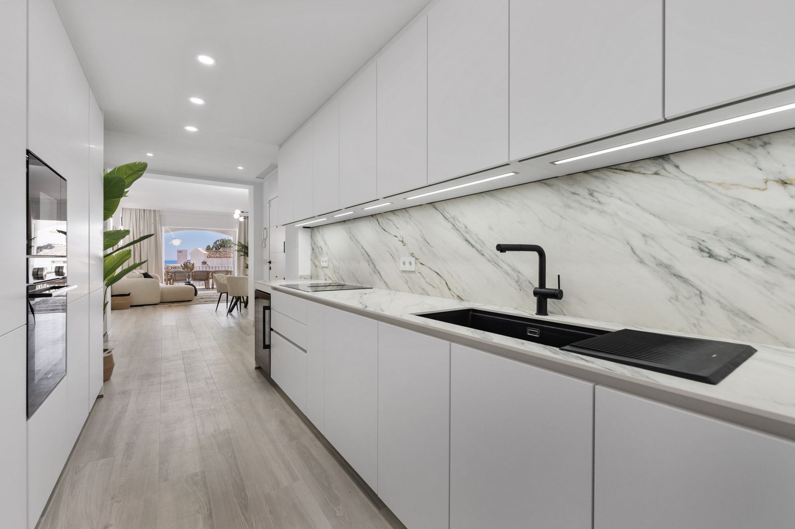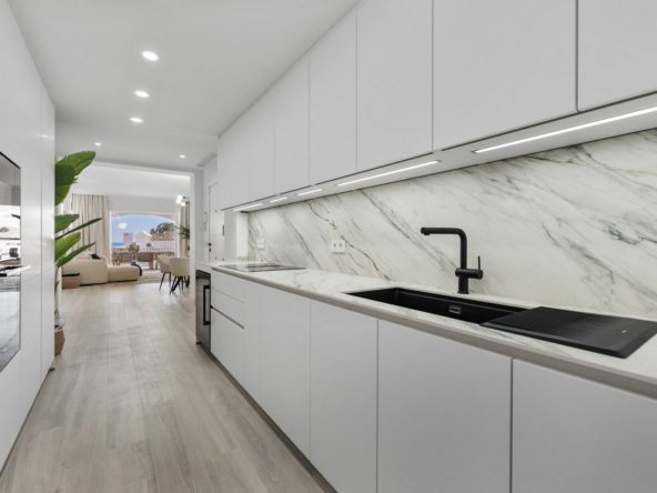 The property features a modern open-plan living area with a spacious kitchen, flowing onto a terrace with views towards the Mediterranean. The front-facing bedrooms enjoy clear sea views, while the rear bedroom overlooks the golf course, giving each space its own distinct outlook.