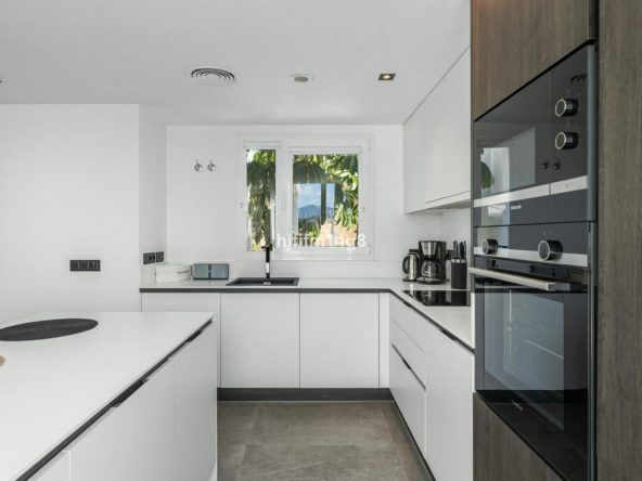 Straight ahead, the hall opens into a bright and airy living room with an open-plan kitchen—a space bathed in natural light thanks to windows in multiple directions. The west-facing terrace flows seamlessly from the living room, offering magnificent panoramic views of the sea, golf course, and surrounding mountains, ideal for enjoying sunsets and outdoor dining.