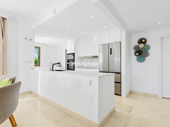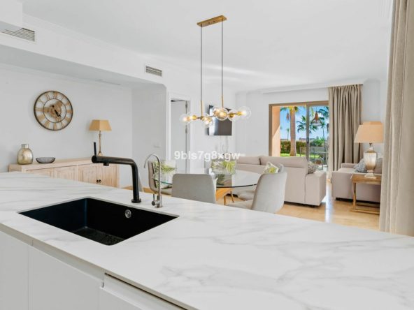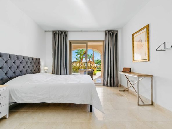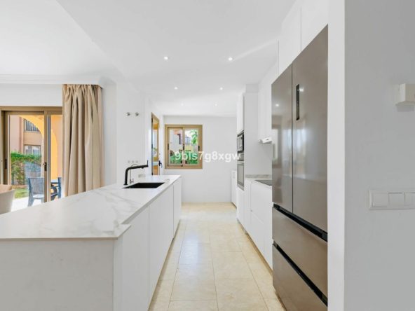 Superb and spacious 127m² ground-floor apartment, ideally located at the highest point of the development. It features two terraces totaling 78m², partially covered (perfect for year-round enjoyment), with direct access to the 140m² communal garden and offering beautiful views of the sea and Gibraltar. Being a corner unit, it enjoys optimal natural light thanks to its three façades and its south/southwest orientation.