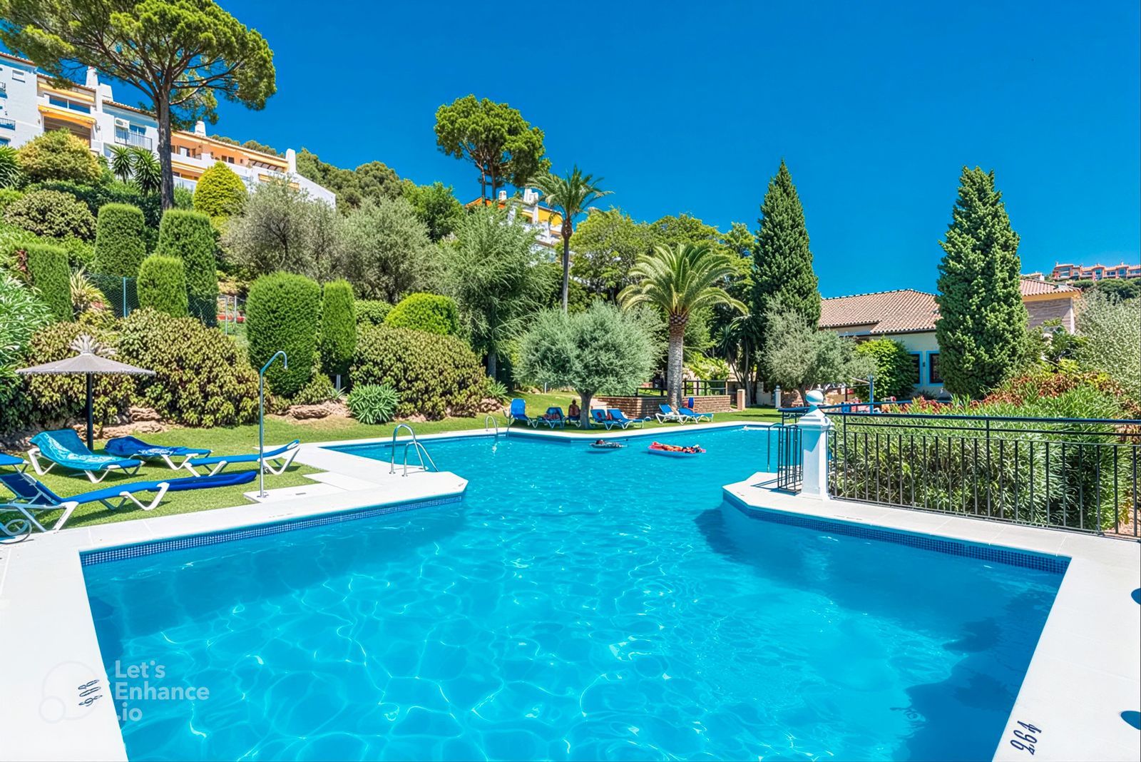 Communal facilities: shared swimming pools surrounded by beautifully landscaped gardens and a tennis court.