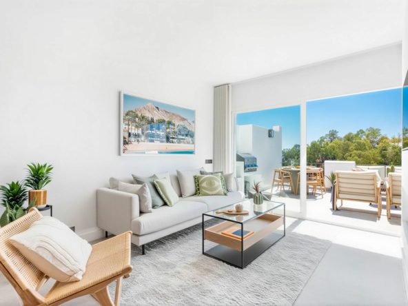 This stylishly renovated apartment features 3 bedrooms and 2 bathrooms, offering breathtaking views of the mountains and the Mediterranean Sea. Thanks to its open-plan layout, the TV area, dining room and fully fitted kitchen flow seamlessly together.