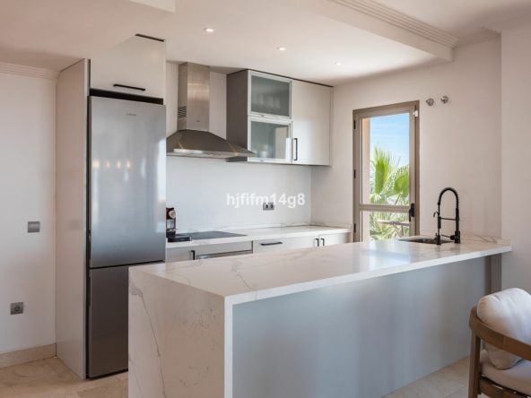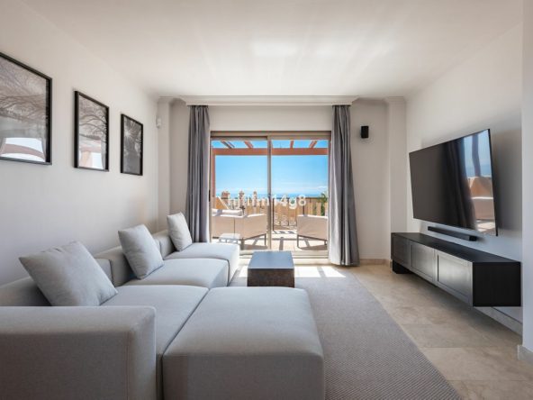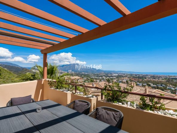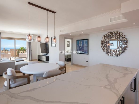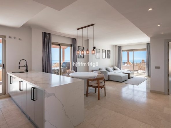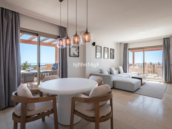 This luxurious single-level penthouse offers stunning panoramic views of the sea and mountains. The property features an entrance hall leading to a spacious living and dining area, which opens onto two terraces: one facing southeast with views of La Concha mountain, the Atalaya Golf Course, and the Mediterranean Sea; the other facing south/southwest, showcasing sweeping vistas of the sea, Gibraltar, and the North African coastline.