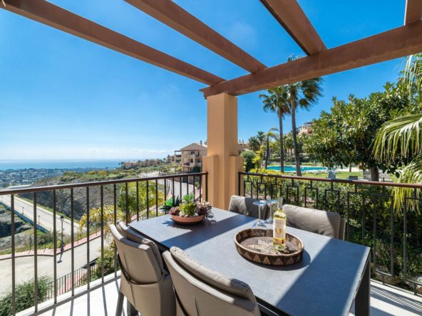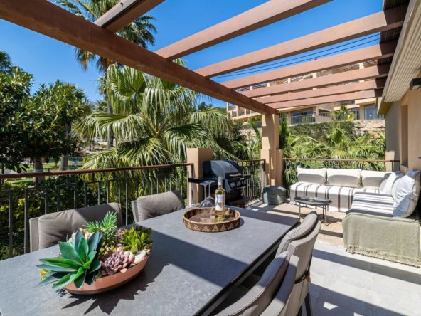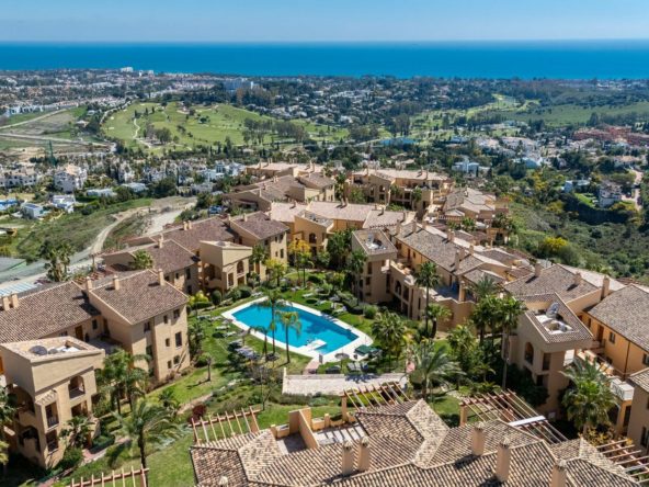 The community offers a range of high-quality amenities, including four swimming pools (one heated), a fully equipped gym, and beautifully landscaped gardens with fountains and a tranquil pond. One of the pools enjoys panoramic sea views, enhancing the sense of resort-style living. Golf enthusiasts will appreciate that several prestigious golf courses are just a few minutes’ drive away.