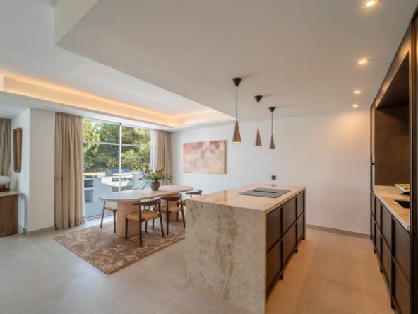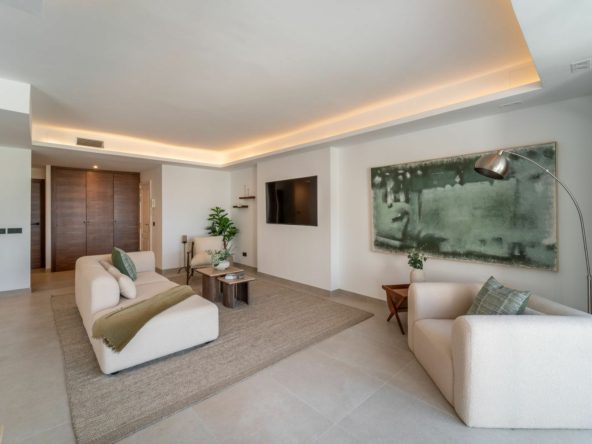 A second well-sized bedroom comes with its own stylish en-suite bathroom. The third bedroom is equally spacious and shares the beautifully appointed main bathroom, which includes underfloor heating for ultimate comfort. Throughout the penthouse, enjoy the ease of a smart AC system, ensuring perfect climate control year-round, and underfloor heating in all bathrooms for an added touch of luxury.