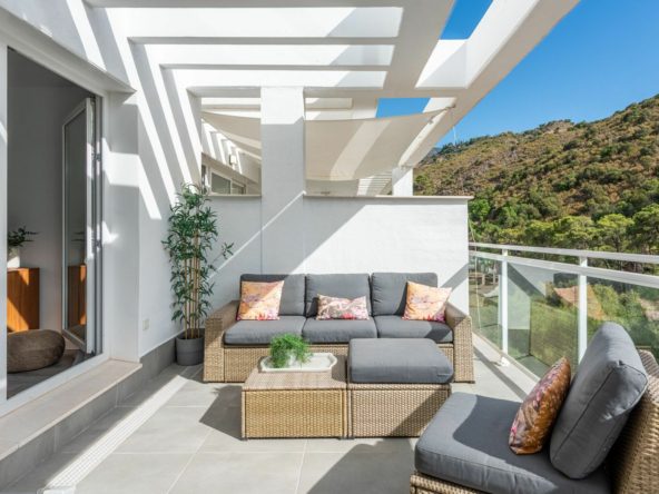 A private terrace extends the living space outdoors, providing an ideal spot for al fresco dining, relaxing, or simply enjoying the pleasant views of the natural surroundings that make Benahavís so special.