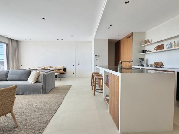 The apartment comprises 3 bedrooms and 2 bathrooms, featuring a spacious open-plan living and dining area with direct access to the large terrace, ideal for year-round outdoor living.