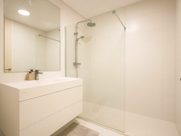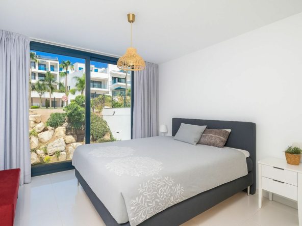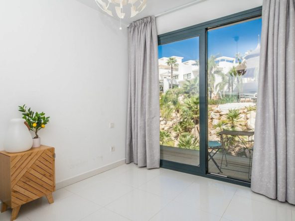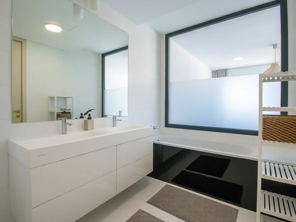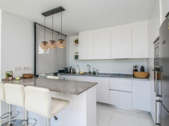 The lower level features a spacious lounge opening onto a large, sunny terrace, a sleek open-plan kitchen with utility area, and three bedrooms – including a master suite with en-suite bathroom and two guest rooms sharing a modern family bathroom. Upstairs, the property impresses with an extraordinarily large roof terrace, offering panoramic vistas of the golf course and the sea to the south side, and serene views over the communal pool to the north. Conveniently positioned within the complex, the penthouse allows for easy access to the pool area directly from the entrance side of the building. Additional features include air conditioning and an underground private parking space, a storage room. This exclusive gated community boasts beautifully landscaped gardens, a serene outdoor pool, indulgent sauna and steam facilities, a traditional hammam, and an elegant outdoor bar area designed for refined leisure and entertainment.