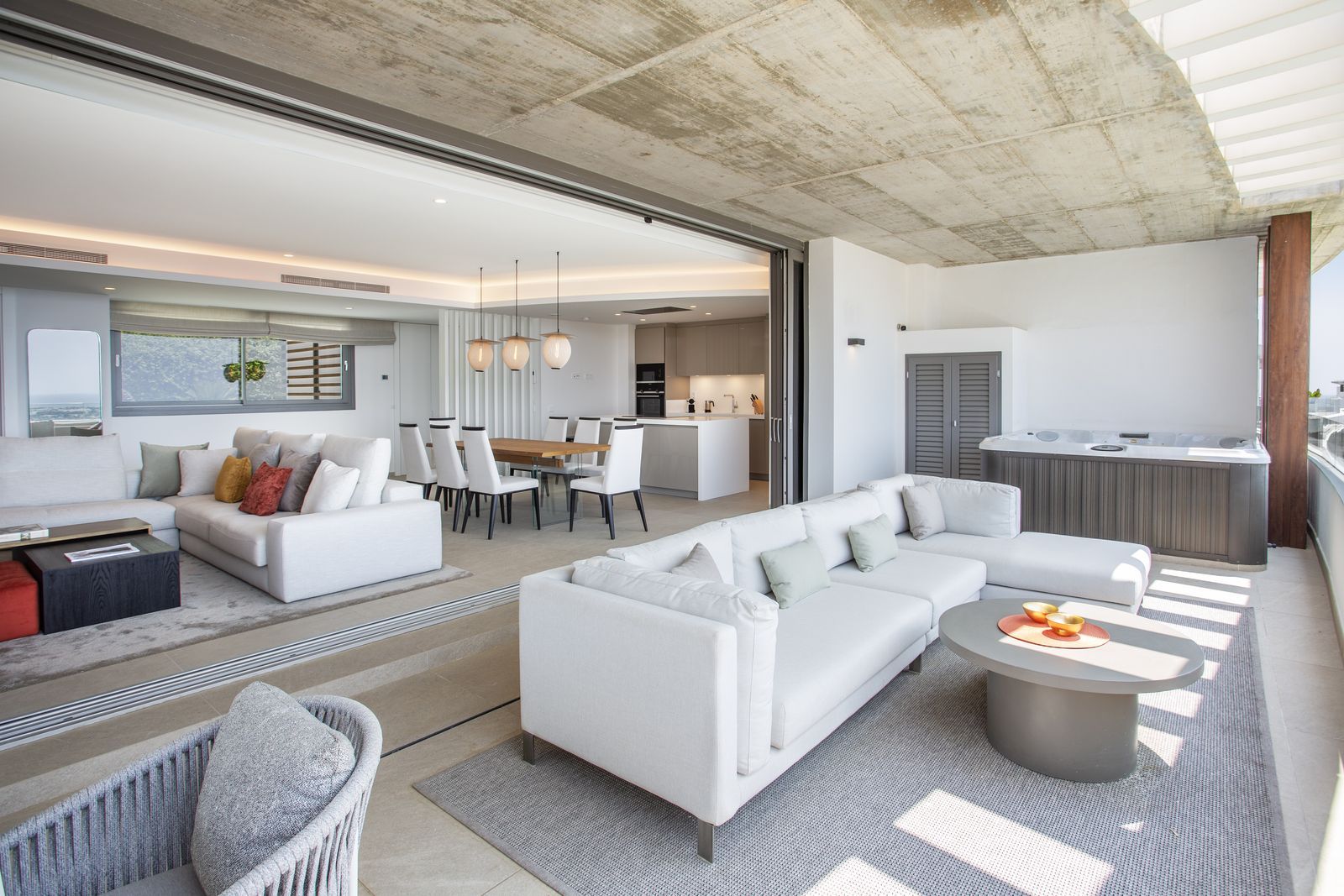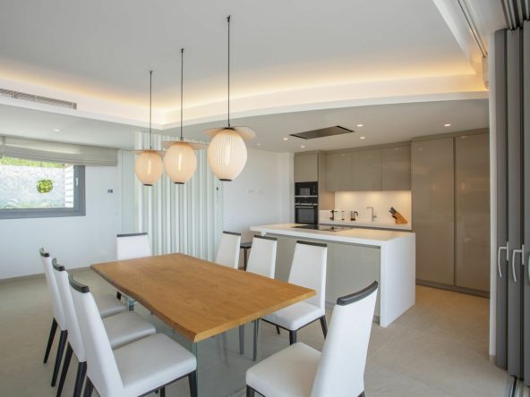 The property has 3 bedrooms, all sea facing and with access to the terrace. The terrace features a jacuzzi and has covered/uncovered sections. The property comes fully furnished by the designer team at Ambience and is ready to move in immediately. There is a separate laundry room and guest toilet and the master suite has a large walk-in closet along side a large en-suite with stand-alone bath (with mountain views!) and walk-in shower.