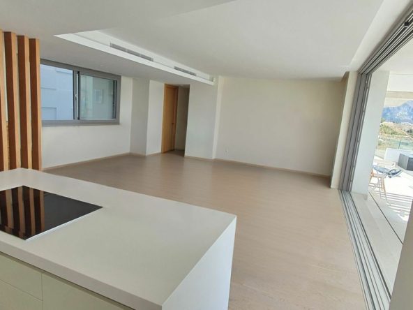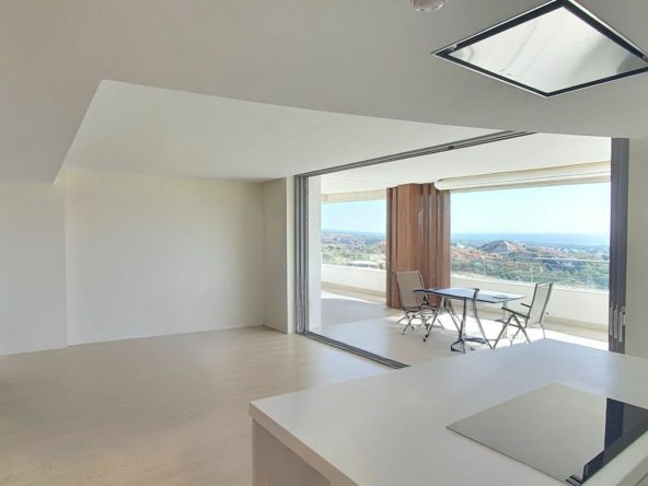 As an upgrade, the property includes wooden flooring in the main living area, high ceilings, abundant natural light, and water-based underfloor heating throughout. The spacious open-plan living area flows effortlessly onto a large terrace, providing the perfect setting to enjoy the spectacular panoramic views.