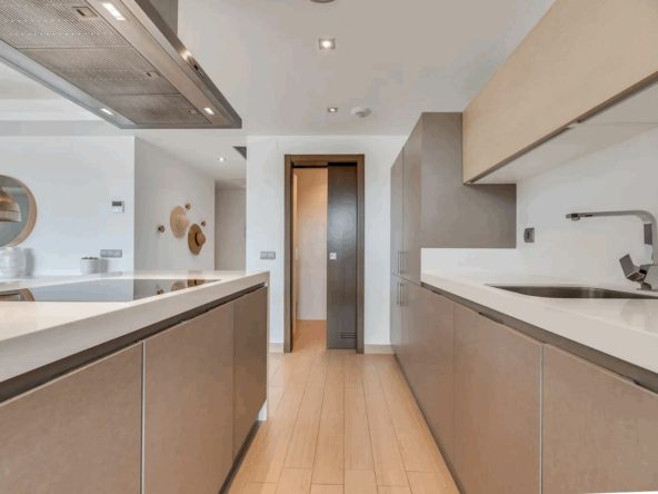 The home, with a built area of 101m²,and a terrace of 103m2 boasts an open and bright layout. The fully equipped kitchen is harmoniously integrated with the living room, creating an elegant common space ideal for leisure and socializing. High-end finishes include marble floors, built-in wardrobes, and an air conditioning system. The property is offered for sale in excellent condition. Additional features include high-speed internet access (Wi-Fi), Smart TV, elevator, and a private terrace overlooking the lush gardens and the heated communal pool, perfect for year-round enjoyment.