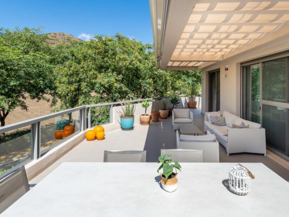 The apartment is very spacious and well-lit. The property has three bedrooms, all with en-suite facilities, as well as a generously proportioned living room and a fully equipped kitchen with Neff appliances. The terrace is accessible from the living room, kitchen and master bedroom, where you can enjoy the views.
