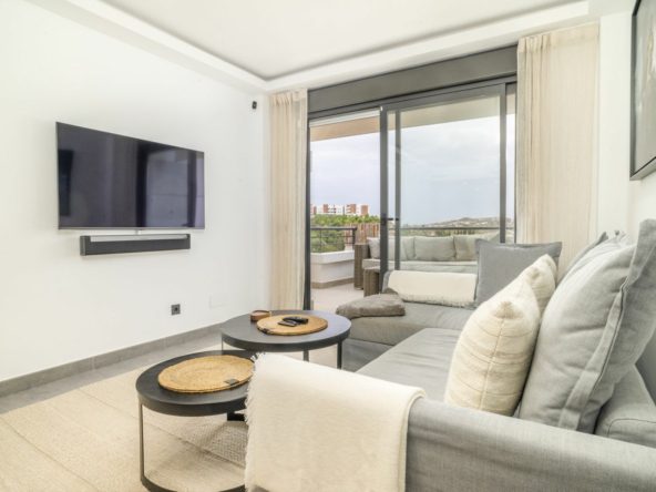 The interior follows a contemporary Scandinavian style, defined by clean lines, bright spaces, and high-quality finishes. The open-plan kitchen, equipped with Siemens appliances, integrates perfectly with the dining and living areas, creating a fluid layout suited for both relaxed living and entertaining. Large sliding doors lead to the west-facing terrace, where residents can enjoy panoramic views over the Los Arqueros golf course and surrounding mountain landscape. From here, sunsets are particularly striking, making evenings on the terrace a highlight of the property.