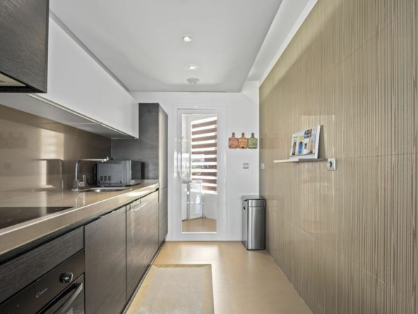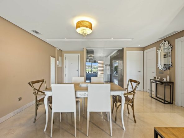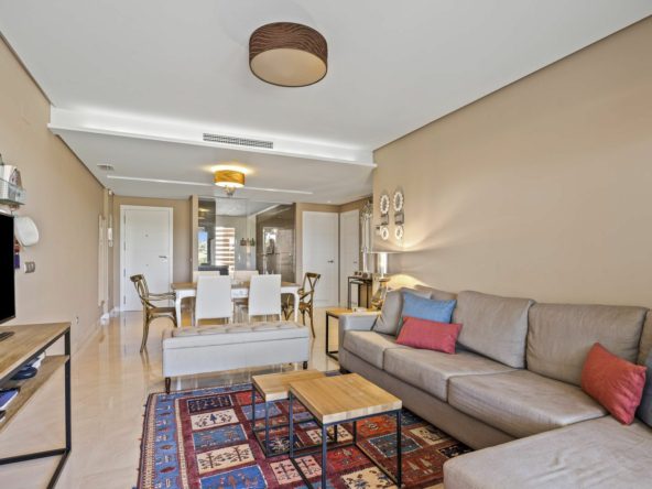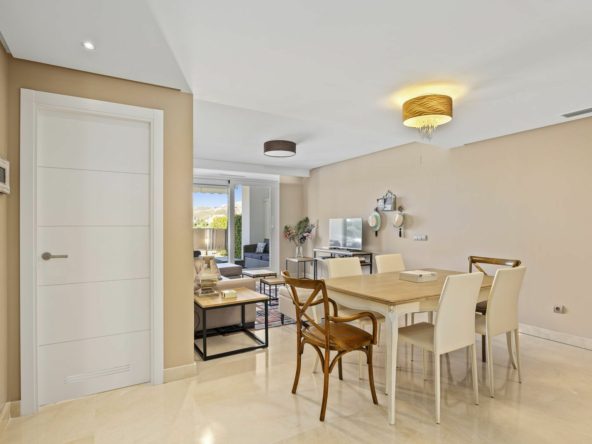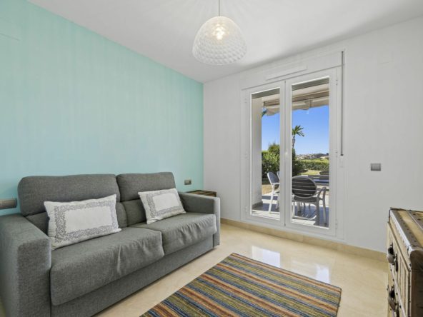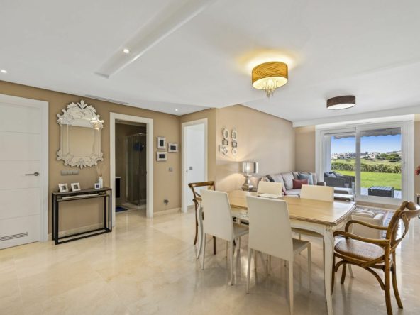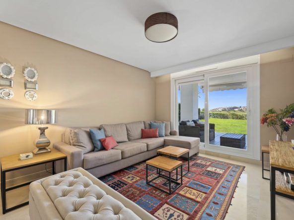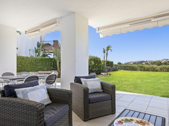 This 3-bedroom, 2-bathroom ground floor apartment is a spacious, tranquil retreat with impeccable interiors, high-end finishes, air conditioning, cream marble floors and a designer kitchen. The highlight of this home is its large private terrace of 48 m2, which opens to a magnificent garden space for private use . Here, you can enjoy with great privacy the stunning open views of the golf course and the sunsets that make this property something truly special. The apartment is sold with part of the furniture.