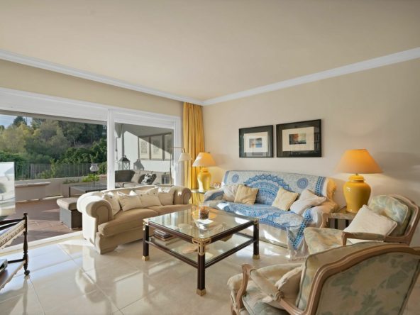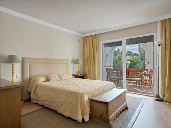Magnificent first-floor apartment located in La Quinta, Benahavis. This two-bedroom, two-bathroom property is situated on the first line of the golf course in Balcones de La Quinta, a gated community with two swimming pools. Due to its generous size and layout, a third bedroom could easily be added. It features air conditioning, electric blinds, a fireplace, and a large terrace with golf course views.