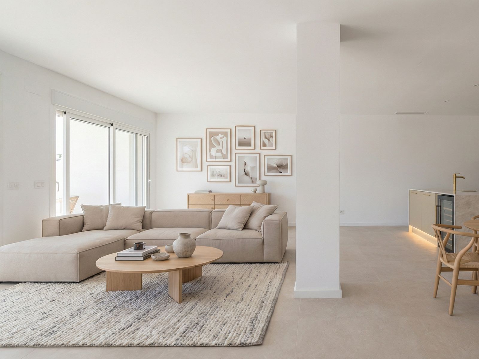 The heart of the home is an expansive living area that prioritizes flow and natural illumination. The renovation has stripped away the unnecessary, leaving behind a canvas of soft textures, organic tones, and high-end finishes. An abundance of floor-to-ceiling glass ensures the golden Andalusian sun is a permanent guest.