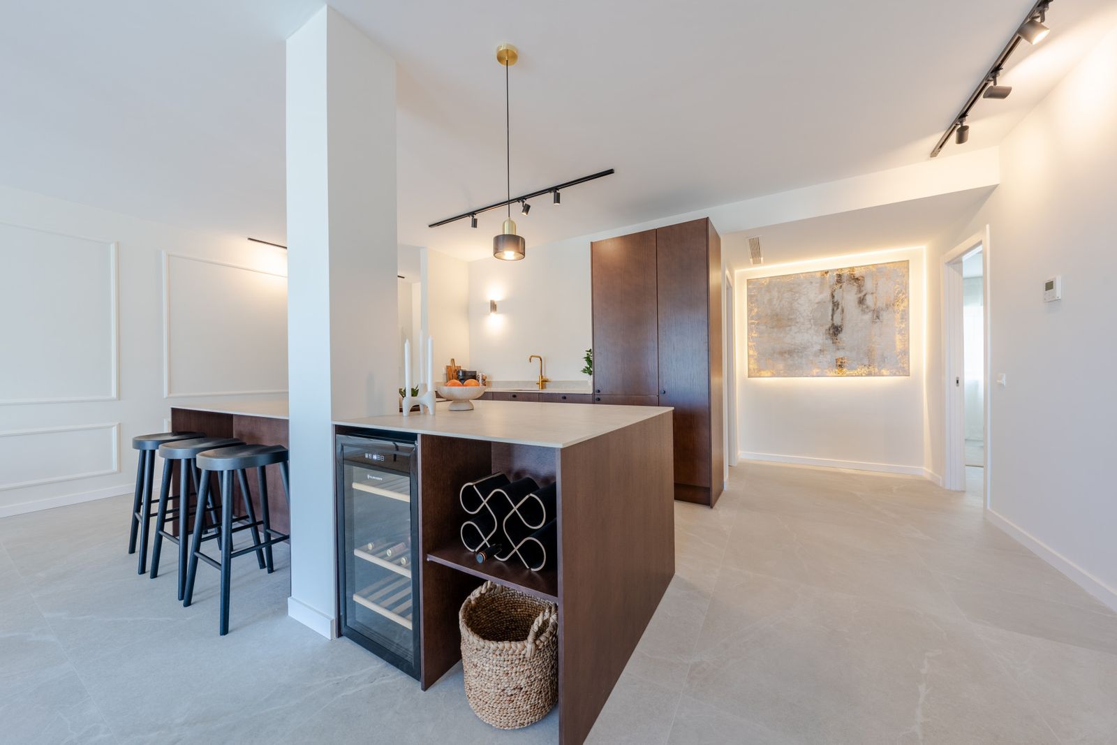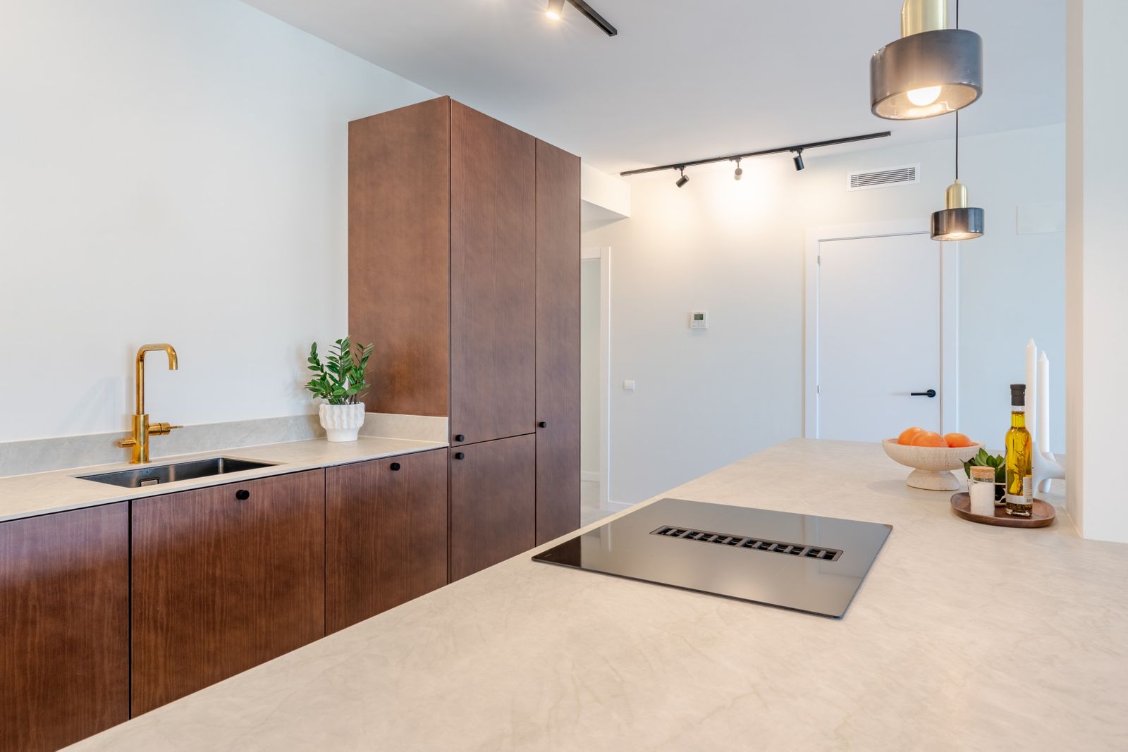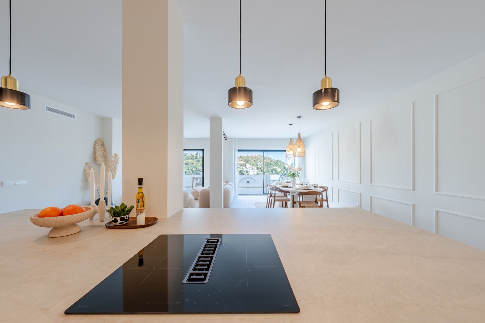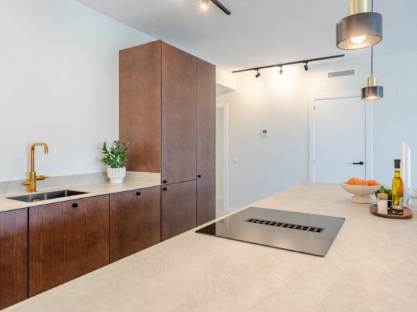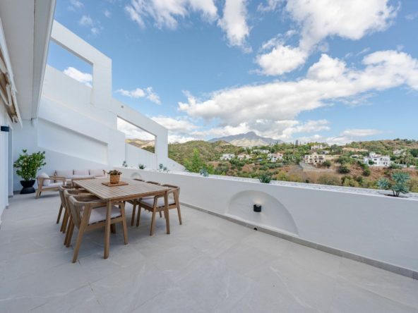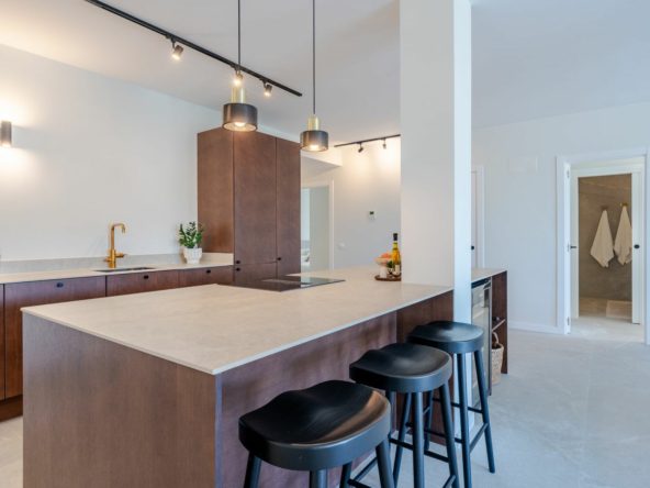 Mirador 5 offers modern design, generous space, and breathtaking views. The open-plan living area combines a bright lounge, dining space, and a fully equipped oak-panelled kitchen with a central island, leading onto a large terrace overlooking the golf course, La Concha mountain, and the sea.