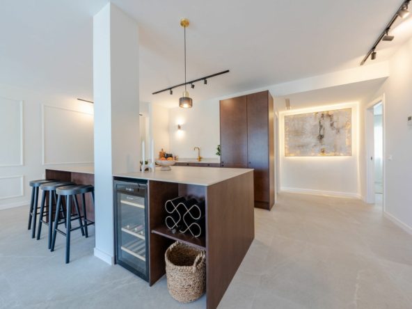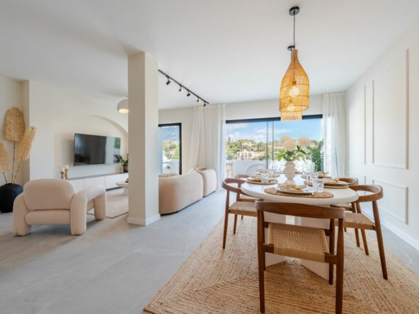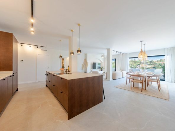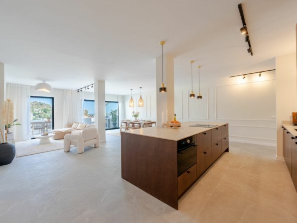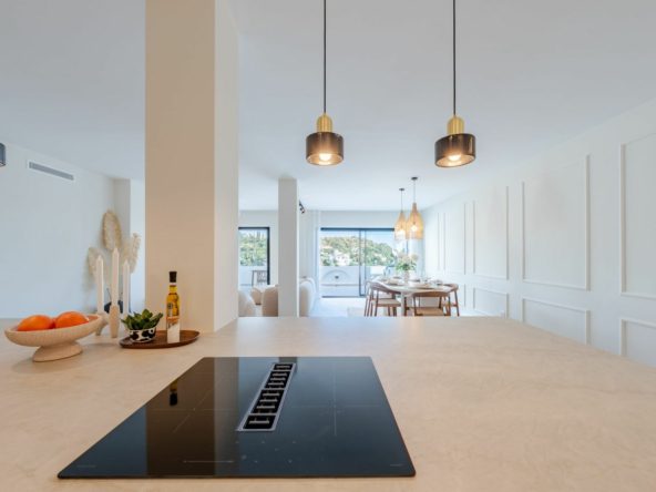 The master bedroom has direct terrace access and sea views, while both guest bedrooms feature en-suite bathrooms. Finishes are of the highest quality, including designer appliances, elegant flooring, and refined décor.