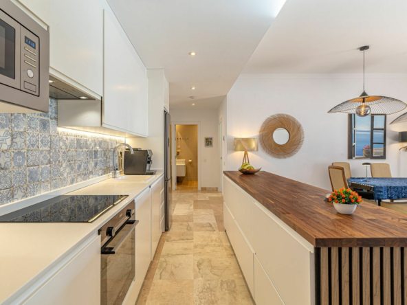 Welcome to this modern and stylish home in the popular Paraiso Pueblo in Benahavís. Here you are greeted by a bright residence with an open-plan layout where the kitchen and living room blend harmoniously together. The kitchen is tastefully designed with decorative tiling, integrated appliances, and a spacious kitchen island that creates a natural gathering point.