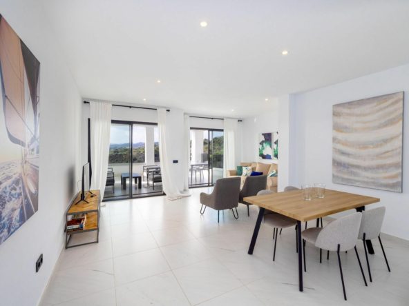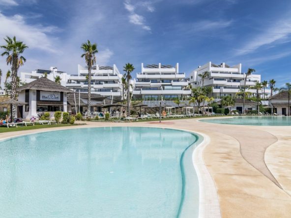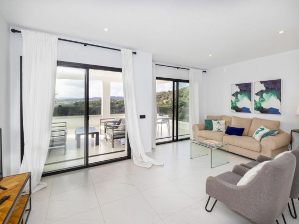 The property features 2 bedrooms and 2 bathrooms, arranged in a bright and spacious layout where every detail has been carefully considered to ensure maximum comfort. The living room, with floor-to-ceiling windows, opens onto a private west-facing terrace that enjoys impressive panoramic views of the Estepona mountain range and stunning sunsets over the Costa del Sol.