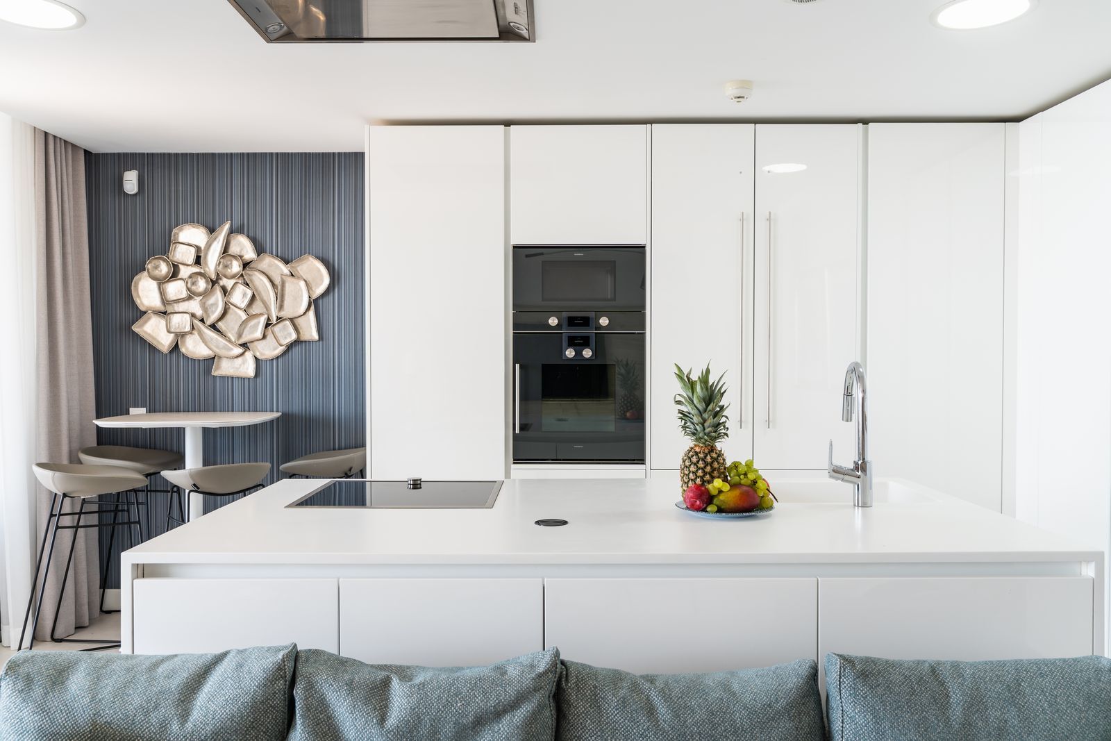 The state-of-the-art kitchen is fully fitted with premium Gaggenau appliances, including a double refrigerator and freezer, and is beautifully integrated into the bright, open-plan living area. Floor-to-ceiling glazing allows the interior spaces to flow effortlessly onto the expansive terrace and private-use garden, offering an exceptional indoor-outdoor living experience.