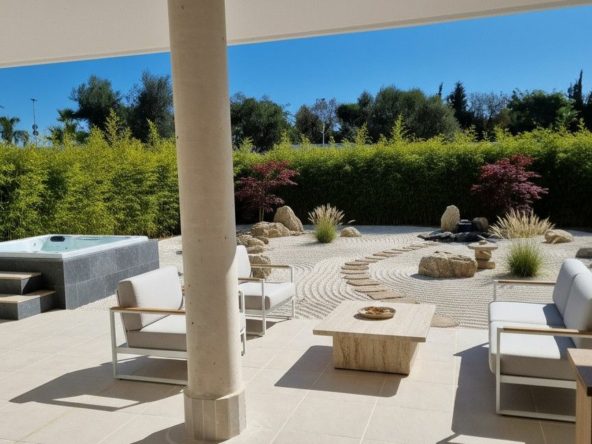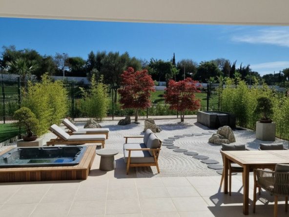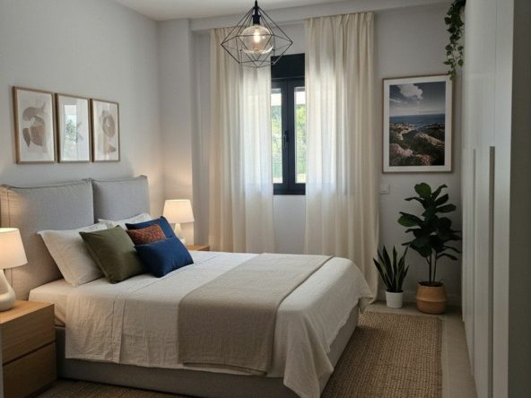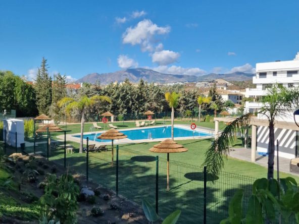 Ground Floor Apartment for sale in Estepona East, Estepona with 2 bedrooms, 2 bathrooms, 2 en suite bathrooms and with orientation south, with communal swimming pool, private garage (1 parking spaces) and private garden. Regarding property dimensions, it has 155 m² built, 100 m² plot, 125 m² interior and 30 m² terrace. Has the following facilities mountainside, amenities near, air conditioning, central heating, utility room, jacuzzi, storage room, gym, alarm, solarium, video entrance, dining room, security service 24h, guest toilet, private terrace, kitchen equipped, living room, country view, mountain view, laundry room, covered terrace, 24h service, electric blinds, gated community, lift, garden view, steam room, unfurnished, close to children playground, close to sea / beach, close to golf, glass doors, separate dining room, open plan kitchen, spa, excellent condition, urban view, ceiling heating system, close to shops, close to town, close to port, close to schools, surveillance cameras, pets allowed, individual a/c units, ground floor patio, aerothermics and internet – fibre optic.