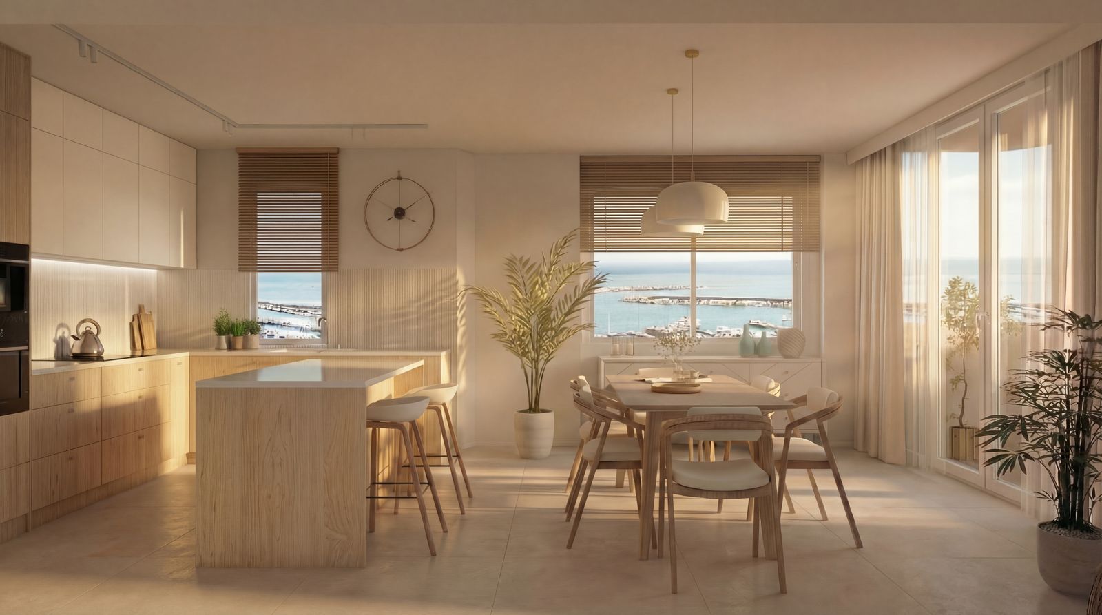 With a total area of 131 m² (110 m² interior), the apartment stands out for its spacious layout, natural light, and seamless connection to the surrounding coastal environment.