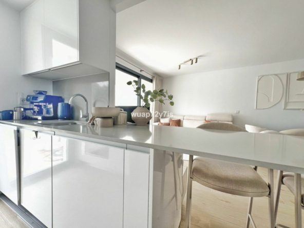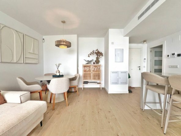 Upon entering the apartment, you are welcomed by a bright and spacious living room that combines a comfortable lounge with sofas, a dining area, and a fully equipped open-plan kitchen. Large sliding doors flood the space with natural light and provide direct access to the generous terrace. To the left lies the first bedroom with its own en-suite bathroom, while further along you will find the master bedroom, also featuring an en-suite and direct access to the terrace.