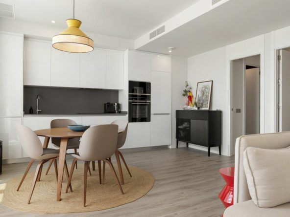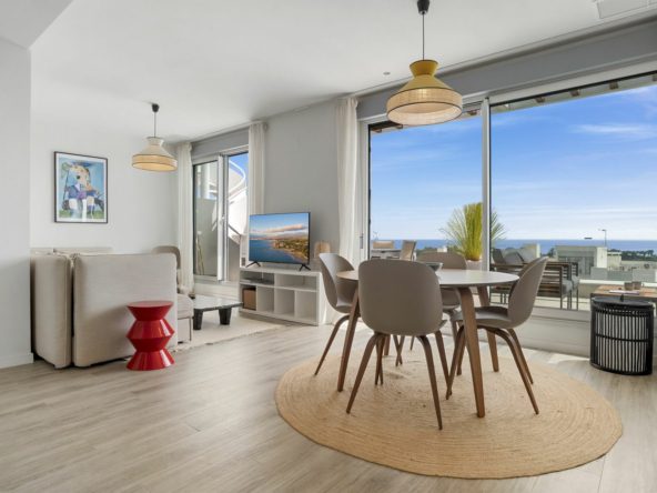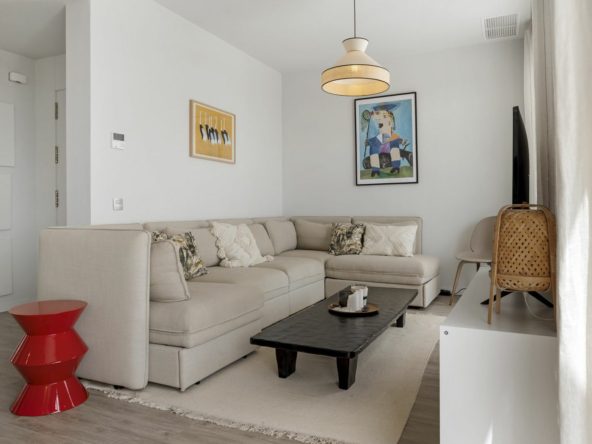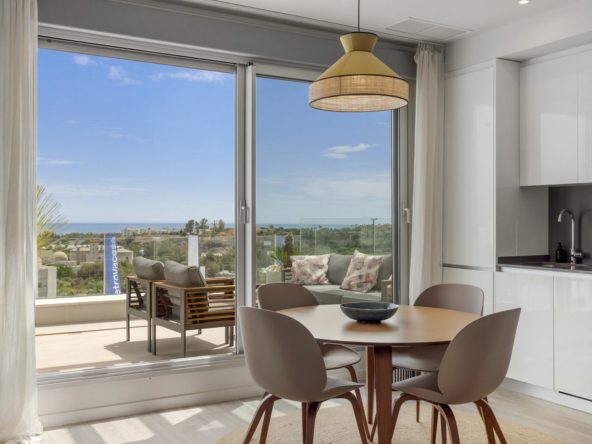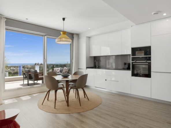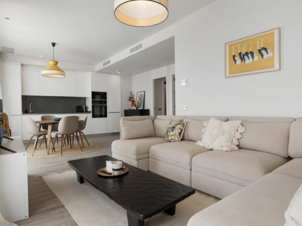 Located in the sought-after Le Mirage Phase III on the New Golden Mile, this stylish 2-bedroom, 2-bathroom corner penthouse offers a perfect combination of modern comfort and prime location. The bright open-plan living and dining area features floor-to-ceiling sliding glass doors that lead to a spacious terrace, filling the home with natural light and framing spectacular views of the sea, mountains, and evening sunsets. The fully fitted kitchen comes with high-quality Siemens appliances, and both bedrooms include fitted wardrobes, with the master benefiting from an en-suite bathroom.