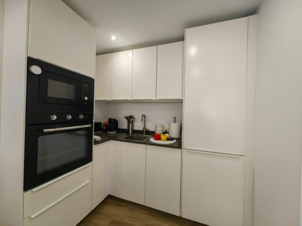The bedroom is complemented by a modern bathroom with a walk-in shower with glass sliding doors and a wall-mounted toilet. Every detail has been carefully renovated to the highest contemporary standards, including a fully fitted kitchen with quality appliances.