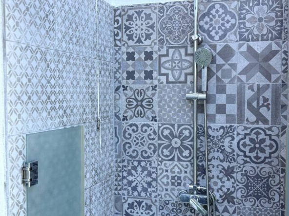 The 98 m² terrace, located on the same level as the apartment, extends the living space outdoors. It includes a fully equipped outdoor kitchen with barbecue, sink, and fridge, a dining area for six, a bar section, outdoor shower, and even a private gym. Part of the terrace is enclosed in glass and currently used as a home office with AC – which can also serve perfectly as an extra guest room.