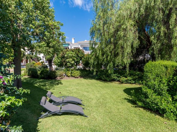 From a spacious Andalucian courtyard with ample storage closets and utilities installed, the entrance leads to a Mayfair mint wood panelled Balay appliance kitchen with opulent green marble surfaces complimented with exquisite detailed wall and floor tiling designed with a convenient open hatch wood panelled doors facing the lounge and the fuchsia bougainvillea filled exterior terrace on front of the gardens. White and light grey marble flooring throughout the living areas, elite specification double insulation thermal windows, integrated mosquito blinds, blackout blinds installed, new Dual Inverter LG Air-conditioning throughout all rooms, new lounge furniture, new beds, upgraded kitchen featuring a dishwasher. Luxuriously styled lounge and dining room offers access to an impressive double aspect dining and relaxation terrace with sun beds and a sunbathing garden area facing the tall tropical palm filled gardens and impressive garden features.