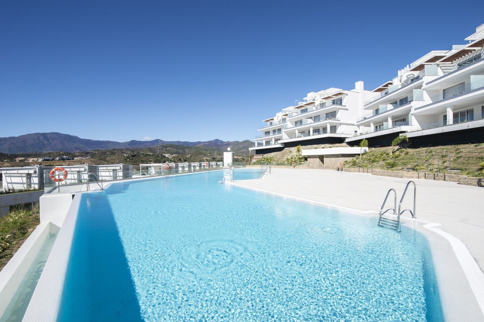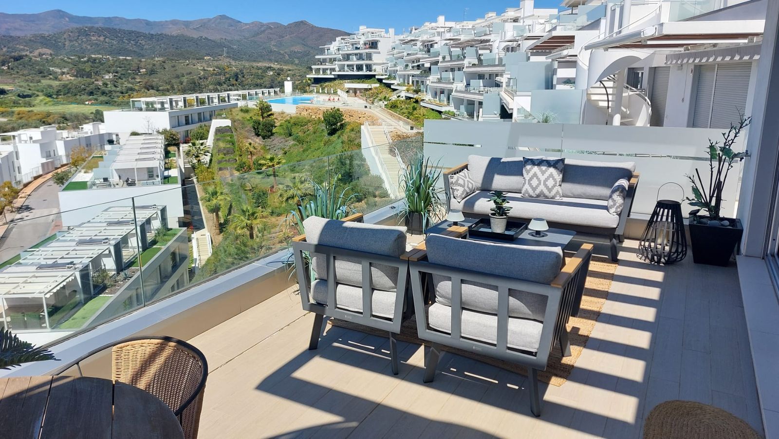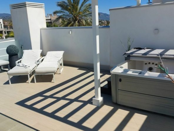 A staircase leads to the 35 m² rooftop solarium, which enjoys all-day sun and uninterrupted panoramic views extending to Gibraltar and the African coastline. The terrace orientation ensures sun from midday through to sunset.
