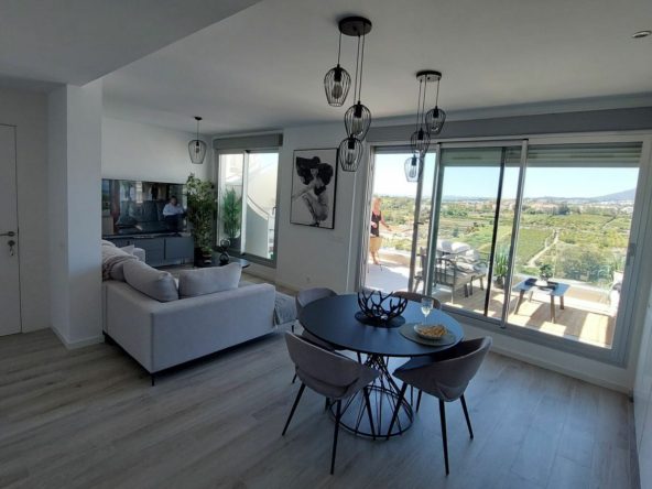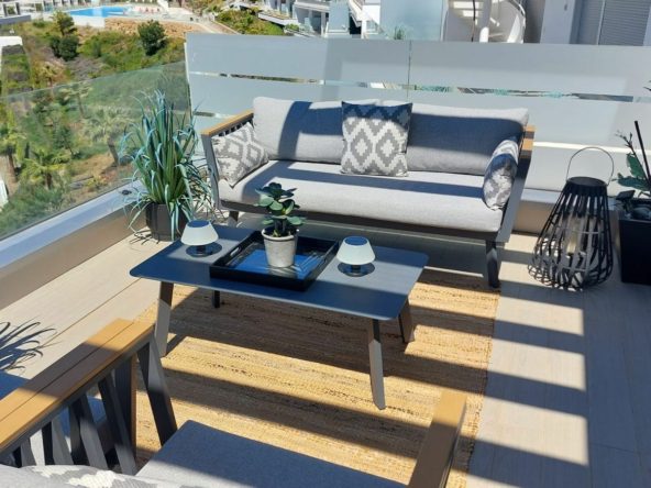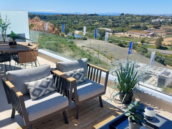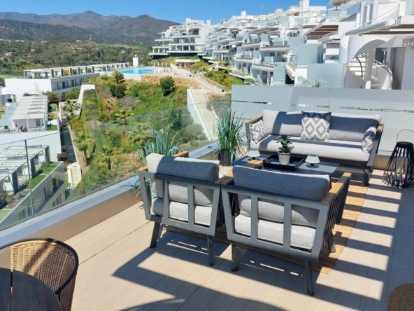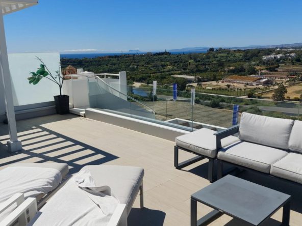 This modern 2-bedroom penthouse for sale on Estepona's New Golden Mile, consists of approximately 89 m² of interior space with 62 m² of terraces, including a private solarium with panoramic sea and mountain views, and is competitively priced at €550,000.