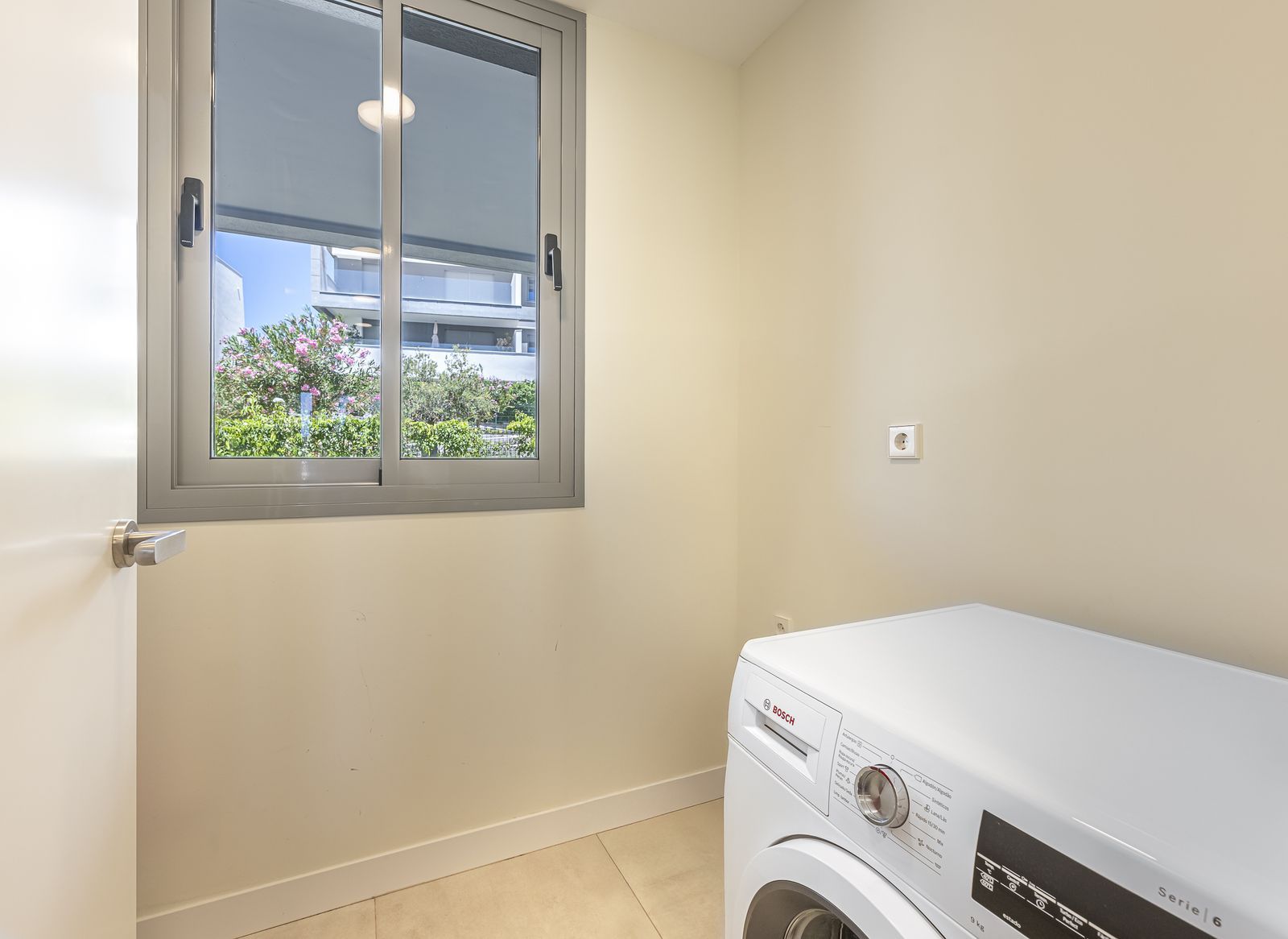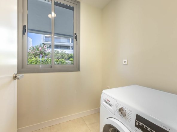 It consists of 2 bedrooms and 2 bathrooms, with a modern, functional, and bright design. The kitchen is open to the living-dining area, fully equipped with integrated appliances, and features a separate laundry room. Large windows in both the living room and bedrooms provide abundant natural light and a pleasant visual connection to the garden. The south-facing orientation ensures sunlight throughout the day and allows for partial sea views.