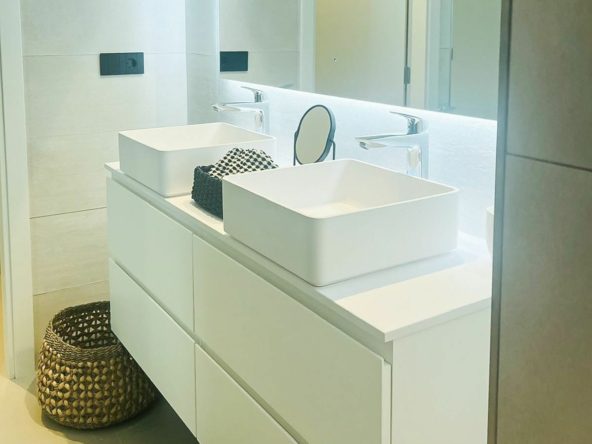 Offering 2 bedrooms and 2 bathrooms. The main bedroom has an open plan bathroom with walk-in shower, anti-fog mirrors, electric towel racks and extra wardrobes. A fully equipped and open plan kitchen with all Bosch appliances and spacious living dining area.