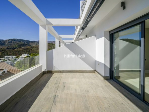 This stunning 2-bedroom duplex penthouse for sale in Ocean Hills, Estepona offers modern, luxurious living with breathtaking panoramic views of the Mediterranean Sea, the surrounding mountains, and the protected natural park that borders the community. Situated in a unique, tranquil setting at the edge of this natural park, Ocean Hills ensures privacy and serenity while remaining just a five-minute drive from Estepona’s beaches. The gated community features two swimming pools, a gym, and beautifully landscaped communal areas, providing a peaceful yet convenient lifestyle on the Costa del Sol.