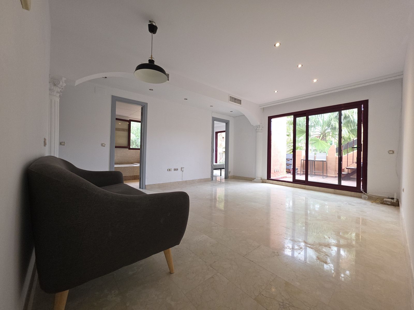 The living-dining room and one bedroom have direct access to a large terrace overlooking the private urbanisation and its beautiful green areas with mature tropical palm trees.