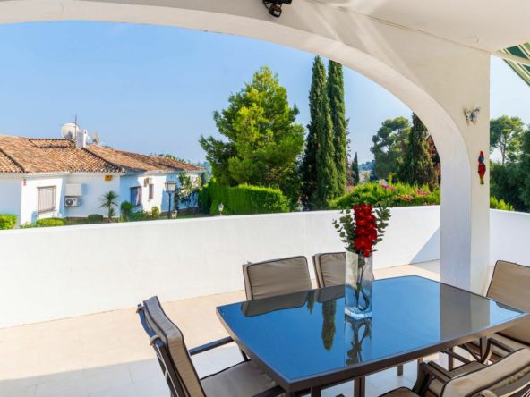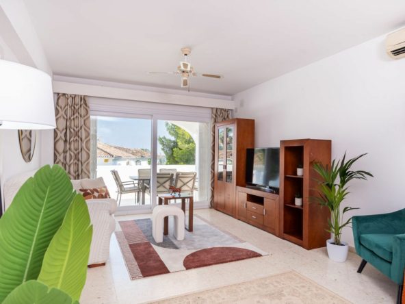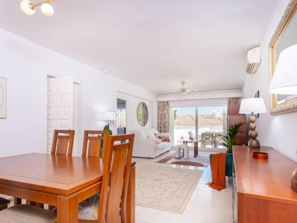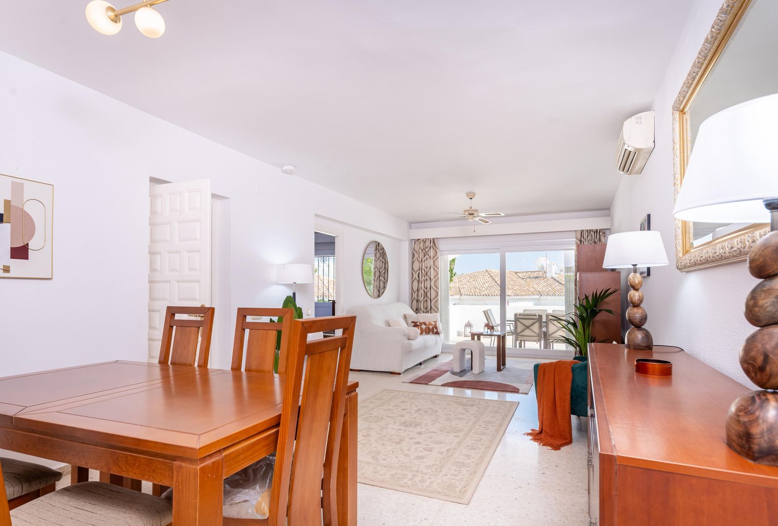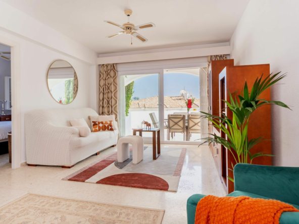 The lounge featurs wall to wall picture windows offering views to the exquisite residential Andalucian tropical green environment and access to a fully renovated enclosed and open exterior terrace with ample dining, sunbathing and relaxation room. A further garden can be accessed from the terrace with steps leading directly to the property garage for 1 car with exterior concourse for parking a further 2nd car.