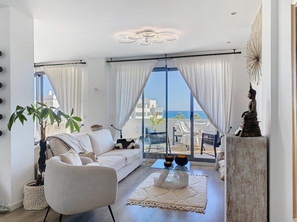 This duplex penthouse is located in the Serenity Views Urbanization, in West Estepona, and stands out for its impressive sea views and spaciousness. The property, situated in a gated community, offers the tranquility of living close to the sea and the convenience of being near golf courses, shops, restaurants, and schools.