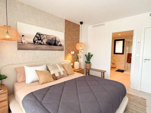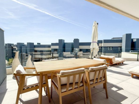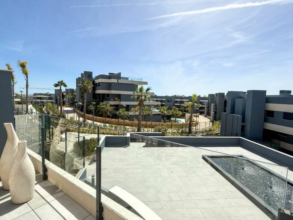 This beautifully furnished apartment features three spacious bedrooms with two bathrooms, bright open plan living, dining and kitchen area with large windows allowing for plenty of natural light. The living area leads onto its large private terrace overlooking the communal garden area and surrounding mountains. Built with the highest finishes and with hot/cold air-conditioning throughout, this property offers the utmost in modern, contemporary living. Underground parking and storage room are also included.
