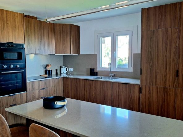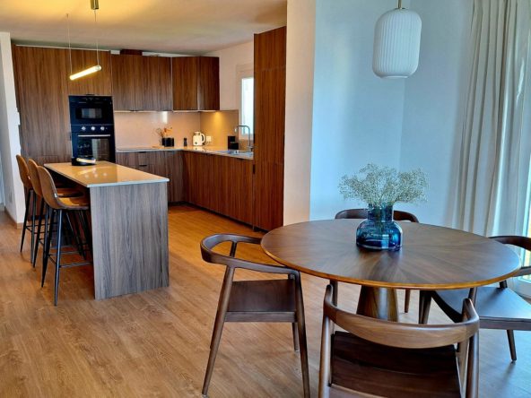 On the main floor, a stylish open-plan kitchen with silestone island seamlessly connects to the bright living-dining area, which opens onto a terrace boasting stunning views of the Mediterranean Sea. This level also features two spacious bedrooms and a full bathroom with a walk-in shower and high-quality finishes.