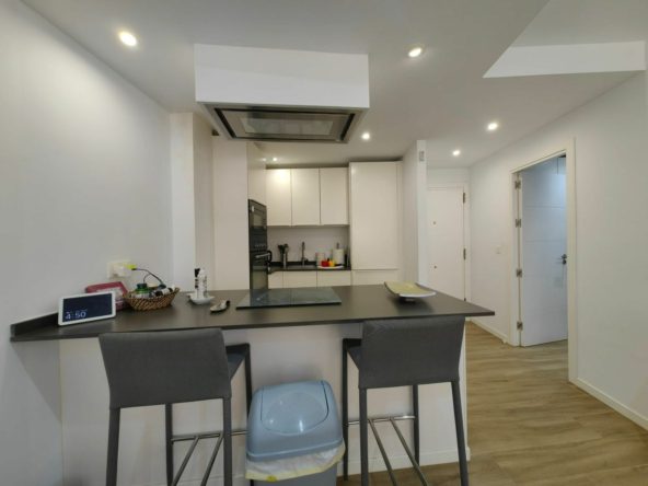 The bedroom is complemented by a modern bathroom with a walk-in shower with glass sliding doors and a wall-mounted toilet. Every detail has been carefully renovated to the highest contemporary standards, including a fully fitted kitchen with quality appliances.