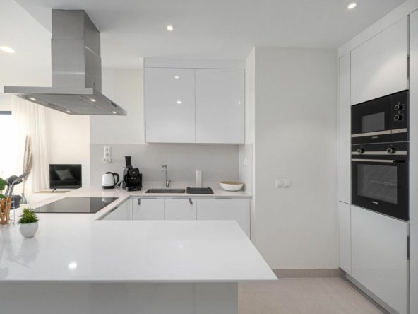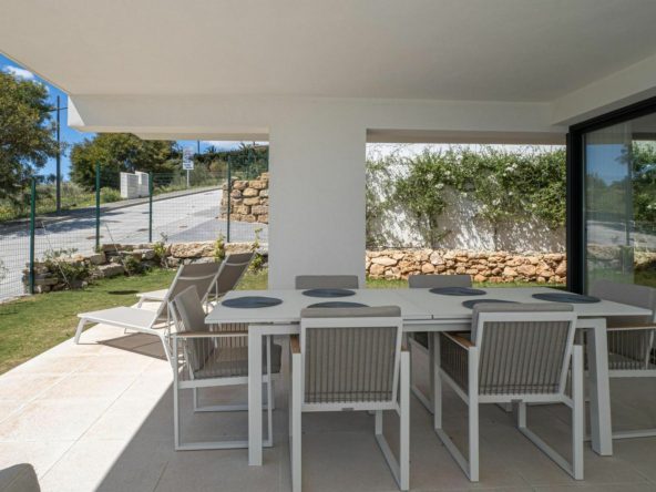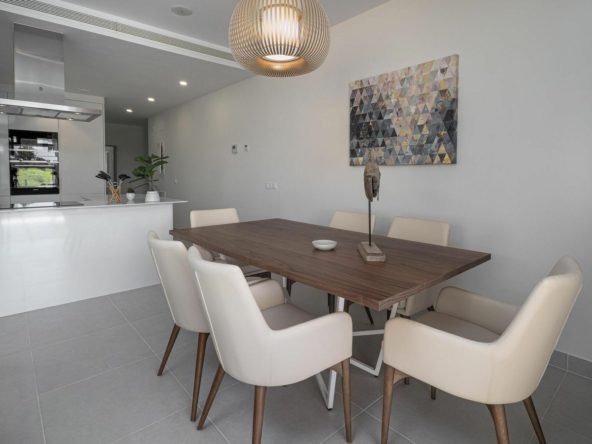 Inside, the apartment is tastefully decorated and fully furnished, featuring high-quality finishes throughout. The open-plan kitchen with a striking central island is fitted with top-quality Siemens A+ appliances. The bright and airy living and dining area flows seamlessly to the terrace and garden through three large sliding doors – blending indoor and outdoor living in true Mediterranean style.
