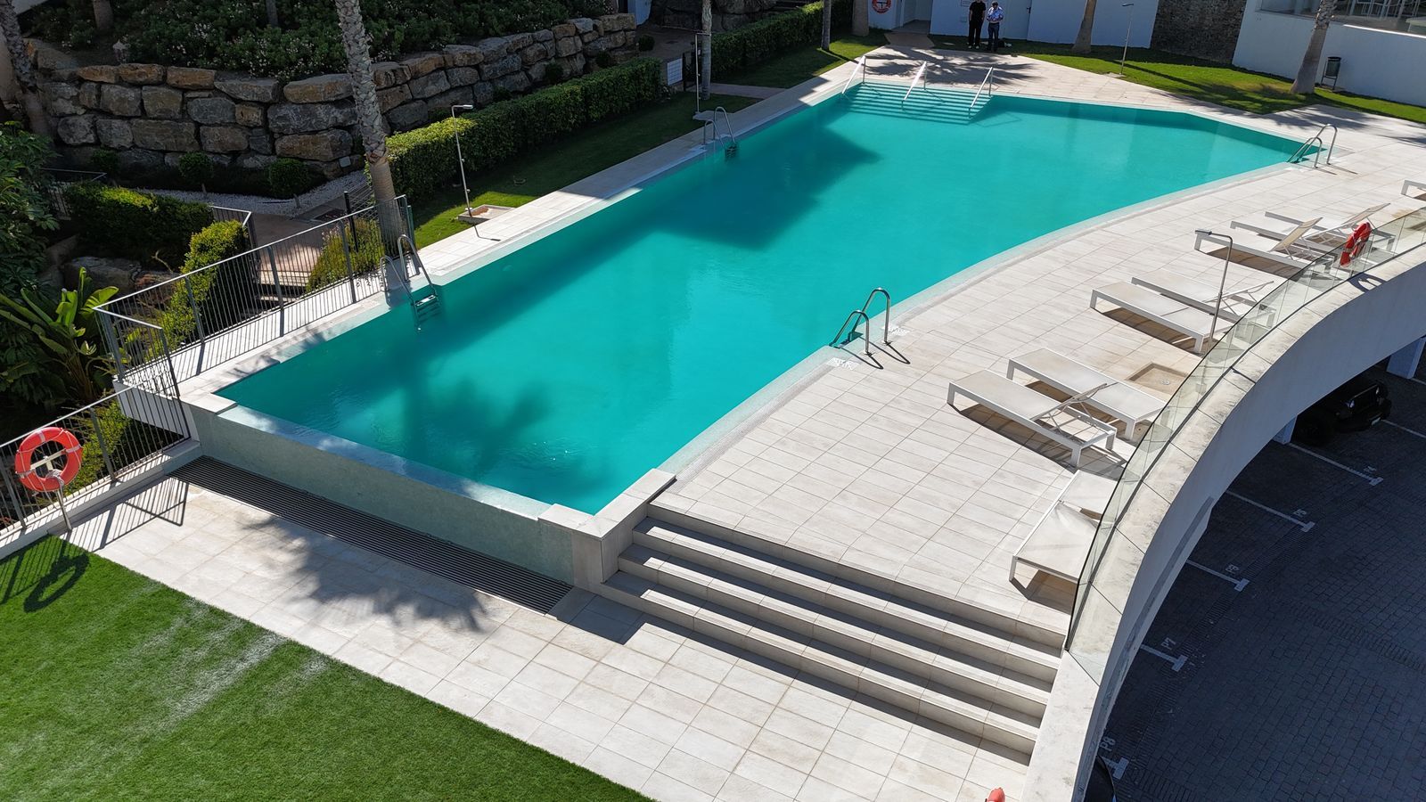 This spacious apartment boasts 125 m² of built living space, an impressive 51 m² sun-drenched terrace, and a private garden of 95 m², beautifully landscaped with a lawn maintained by the community. Thanks to its corner position and oversized windows, it enjoys abundant natural light and breathtaking views of the sea, the Sierra Bermeja mountains, and the swimming pool.