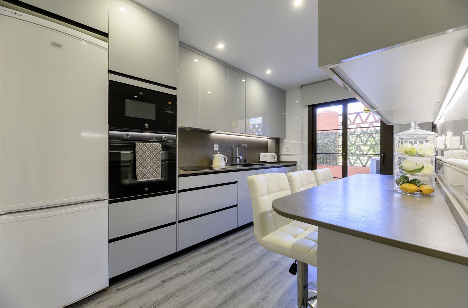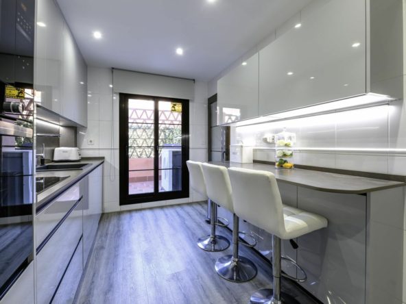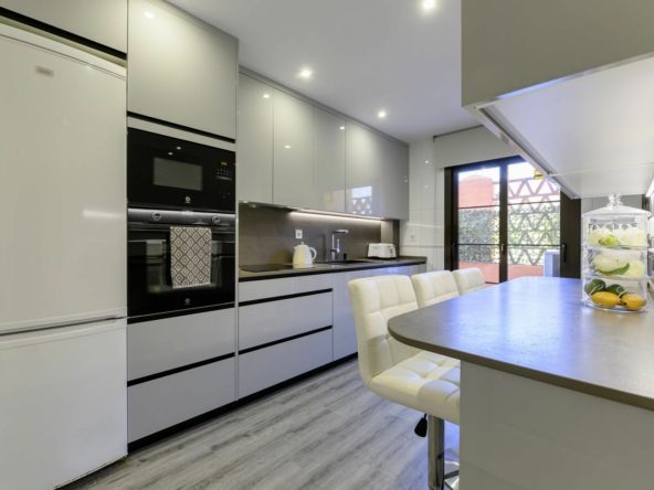 One of the standout features is the layout. Upon entering, there is a guest toilet, which is not commonly found in this urbanisation. The fully renovated kitchen found to your right as you enter is modern and well-equipped, with access to a large rear terrace and separate utility area.