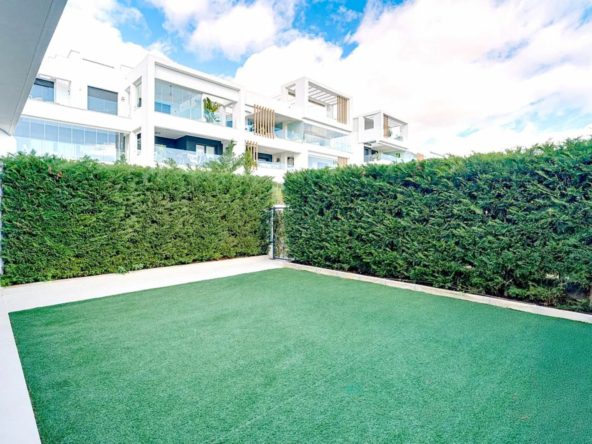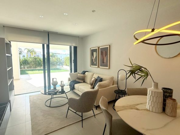 The home features a bright open living and dining area with direct access to a private terrace and garden, creating a seamless indoor-outdoor lifestyle. Accommodation includes a master bedroom with en-suite bathroom, a guest bedroom, and an additional guest bathroom. The fully fitted kitchen is complemented by a separate laundry area and a private rear patio, adding to the home’s practicality. From the garden, there is direct access to the beautifully maintained communal areas.