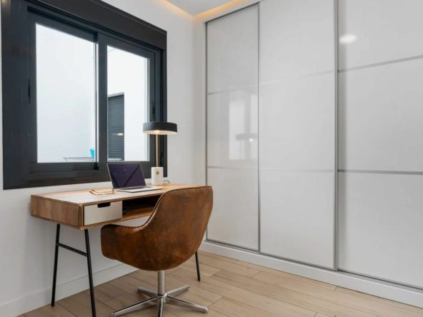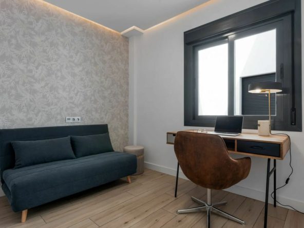 The property offers two bedrooms and two bathrooms. The spacious master bedroom includes large built-in wardrobes and an en-suite bathroom with walk-in shower, toilet and washbasin. The second bedroom is stylishly arranged as an office space with a sofa bed – ideal for guests or working from home. The second bathroom is also modernly finished and equipped with a walk-in shower, toilet and washbasin.